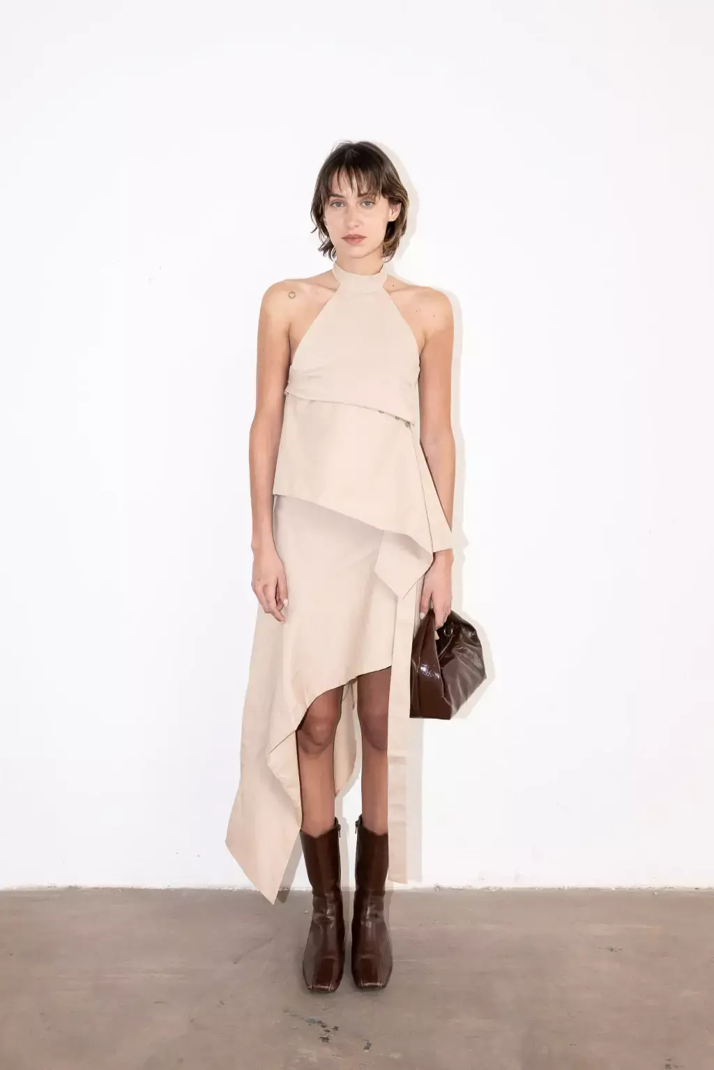 Falda de bengalina realizada con molderia intuitiva, irregular de recortes encastrados. Tiene combinaciones de red que le da transparencias en algunas partes.
